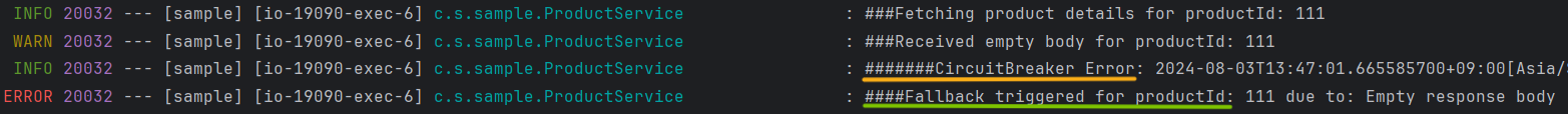 #######CircuitBreaker Error: 2024-08-03T13:47:06.739636400+09:00[Asia/Seoul]: CircuitBreaker 'productService' recorded an error: 'java.lang.RuntimeException: Empty response body'. Elapsed time: 0 ms