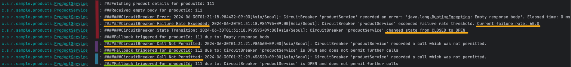 #######CircuitBreaker Failure Rate Exceeded: 2024-08-03T13:47:06.739636400+09:00[Asia/Seoul]: CircuitBreaker 'productService' exceeded failure rate threshold. Current failure rate: 60.0