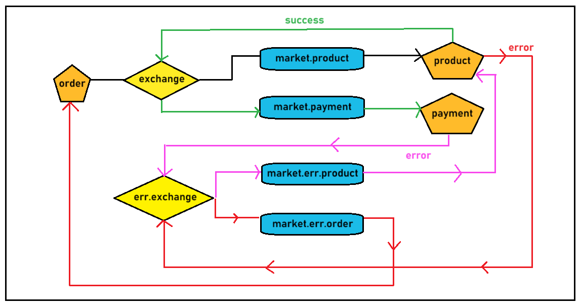 - product에서 문제가 없을 경우, exchange, maket.payment (queue)를 통하여 payment(Consumer)로 메시지를 보내준다.