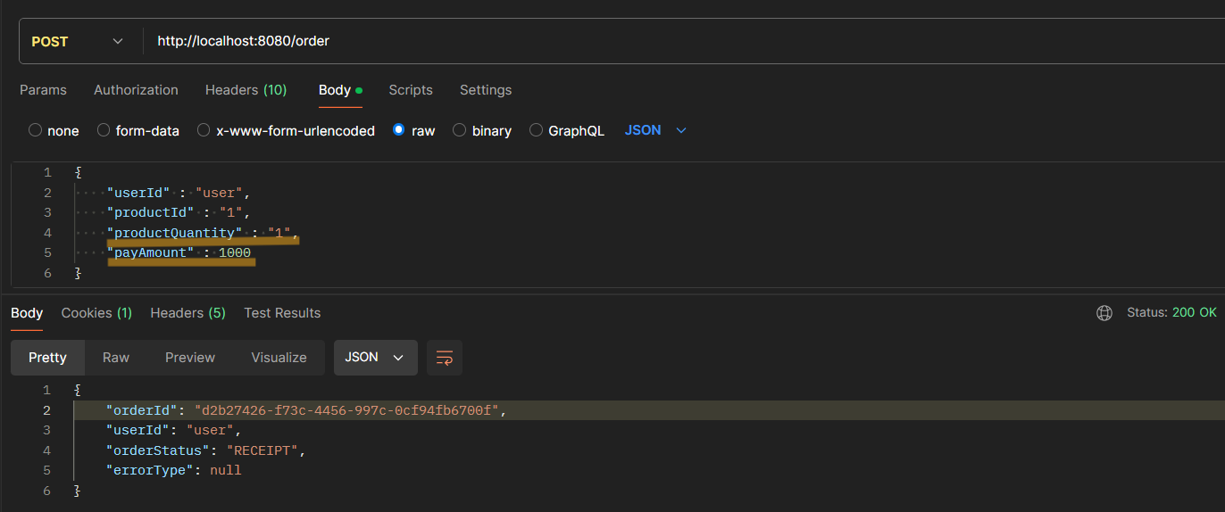 - productQuantity가 1이고, payAmount가 10000보다 작을 경우 모든 로직이 성공적으로 동작한다.