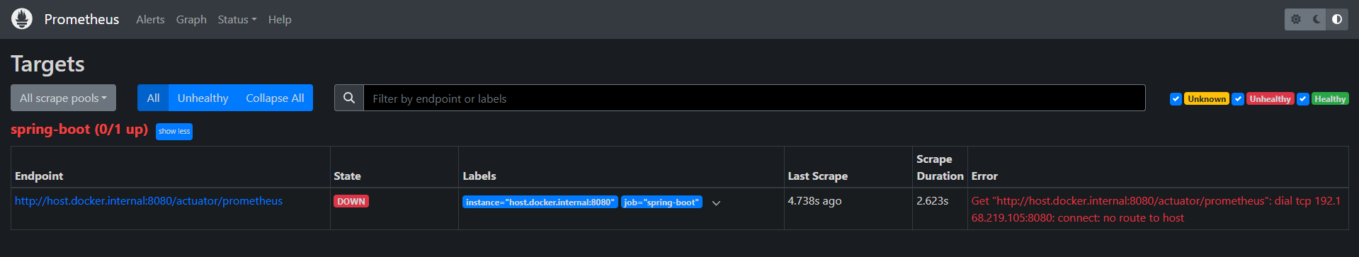 프로메테우스를 사용하기 위해 docker에서 실행을 시켰는데 Get "http://host.docker.internal:8080/actuator/prometheus": dial tcp 192.168.219.105:8080: connect: no route to host 에러가 발생하였다😭