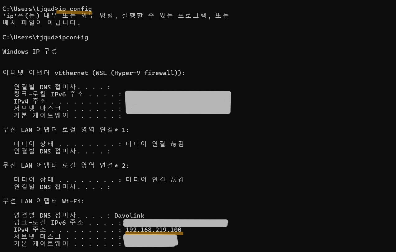 - cmd를 열고 ipconfig를 입력하여 확인이 가능하다.