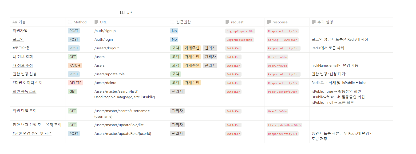 이렇게 방향을 잡은 이유는 회원의 토큰을 Redis에서 보관하여 DB의 부담을 줄어줄 계획인데 만약 권한이 수정되면 레디스의 권한도 수정되므로 수정된 권한으로부터 토큰을 재발급 받는 로직을 만들기 위해서 이 방향으로 가자고 팀원들에게 건의하고 정책을 정하였다.