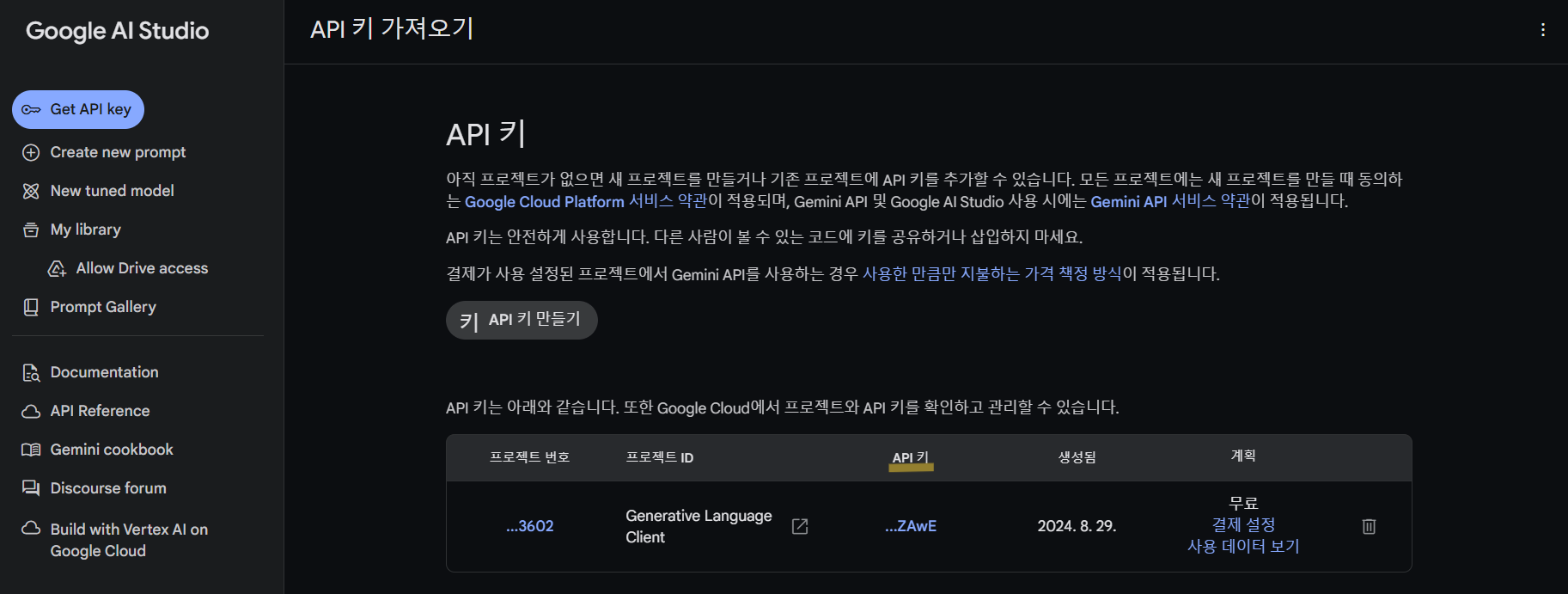 - https://aistudio.google.com/ 에 들아가서 API 키를 발급 받습니다.