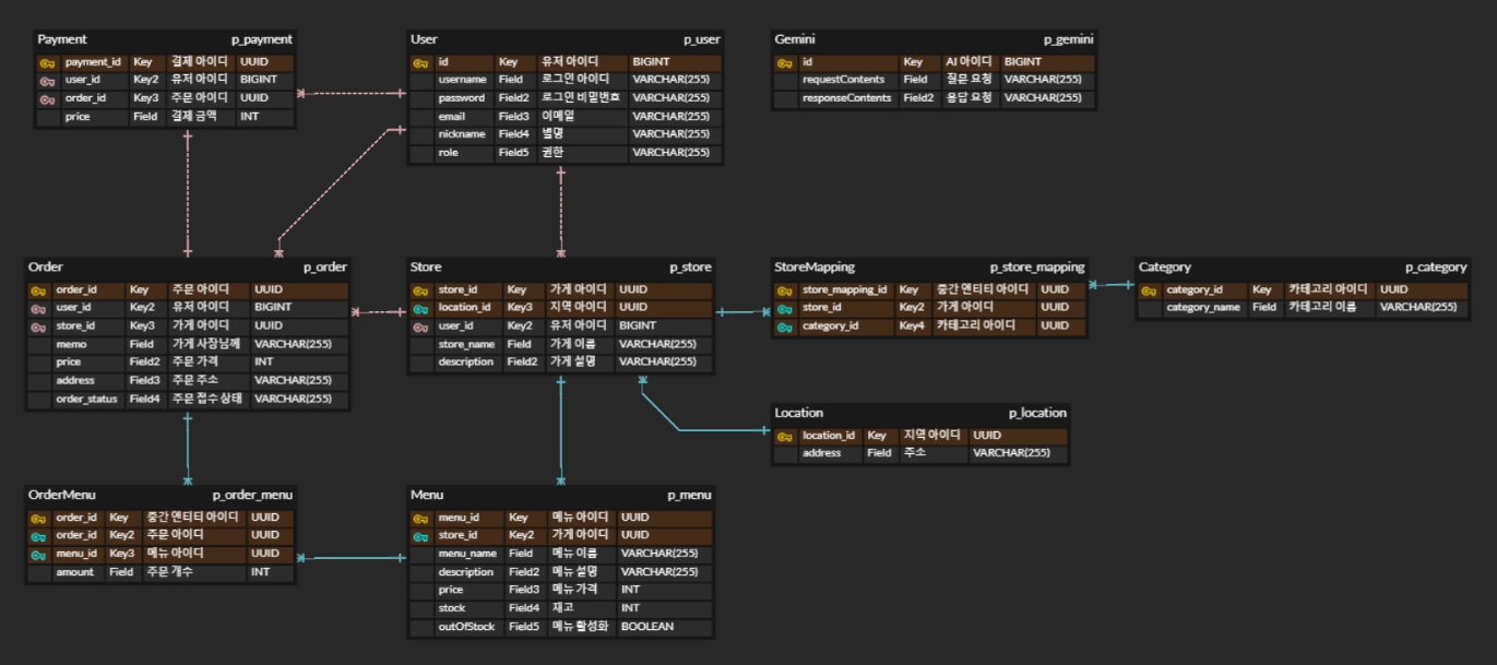 - 모든 Entity가 TimeStamped를 상속받고 있지만 이를 모두 표현하면 테이블의 필드가 너무 많아지기 때문에 편의상 생략하였습니다.