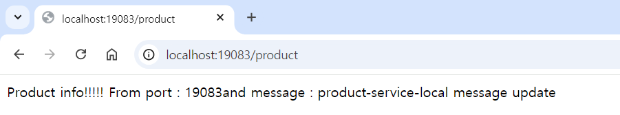 - Product의 Application.yml에서 설정해준 서버포트 값인 "0" , 메시지 내용 "default message"가 아닌,