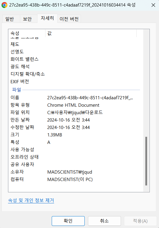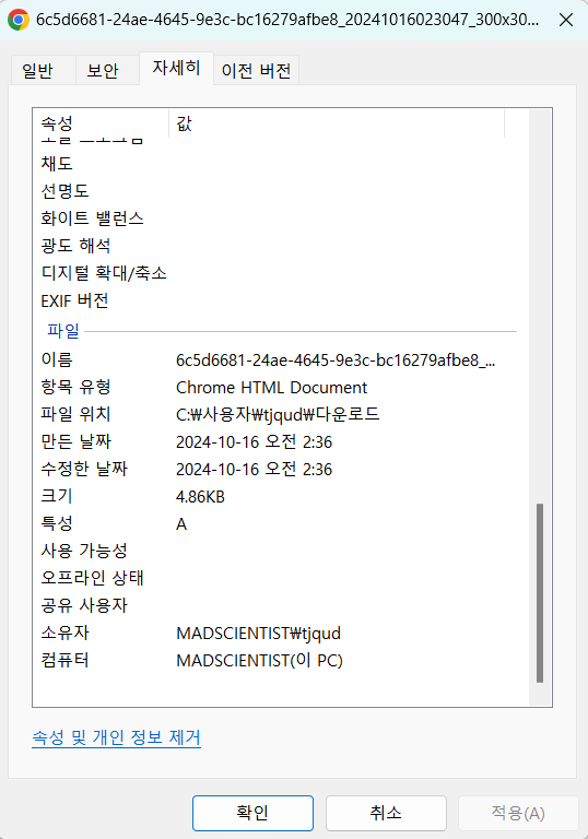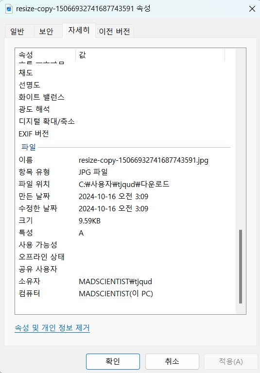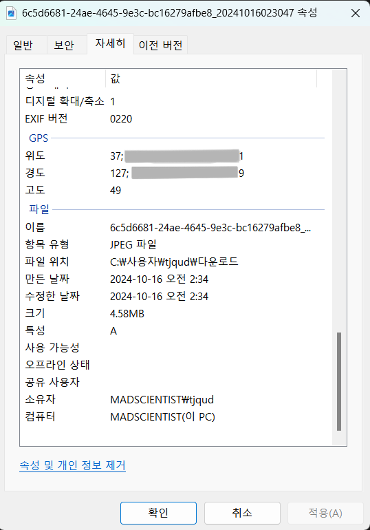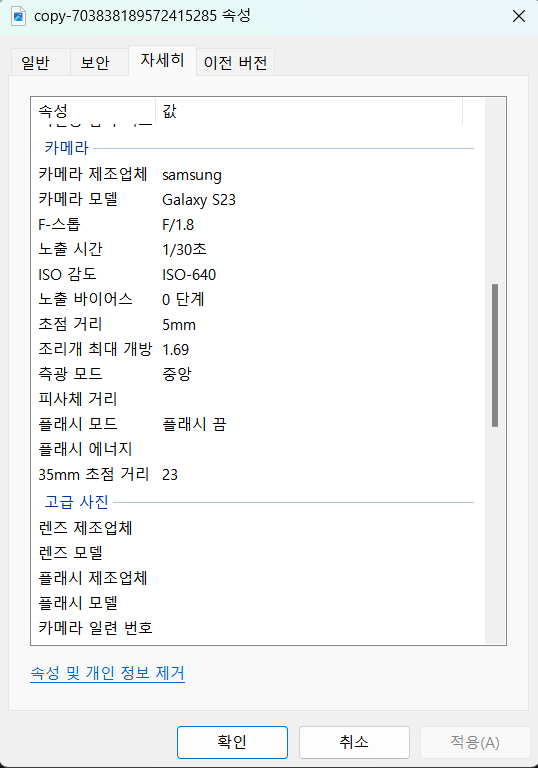 - 카메라 기종과 GPS 데이터가 삭제된 것을 볼 수 있다