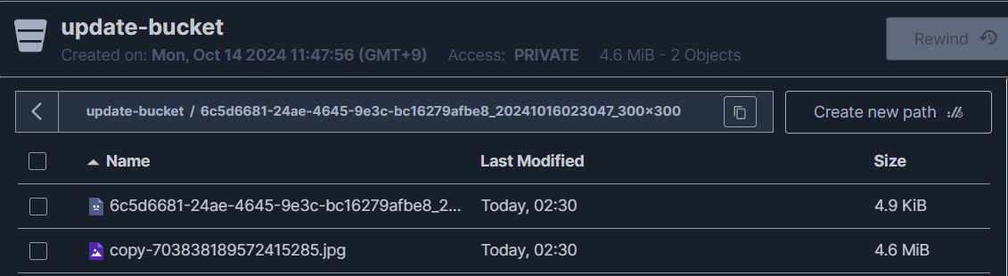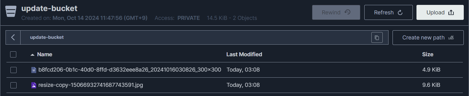 - MINIO 스토리지에 ResizeFile이 업로드된 모습을 볼 수 있다