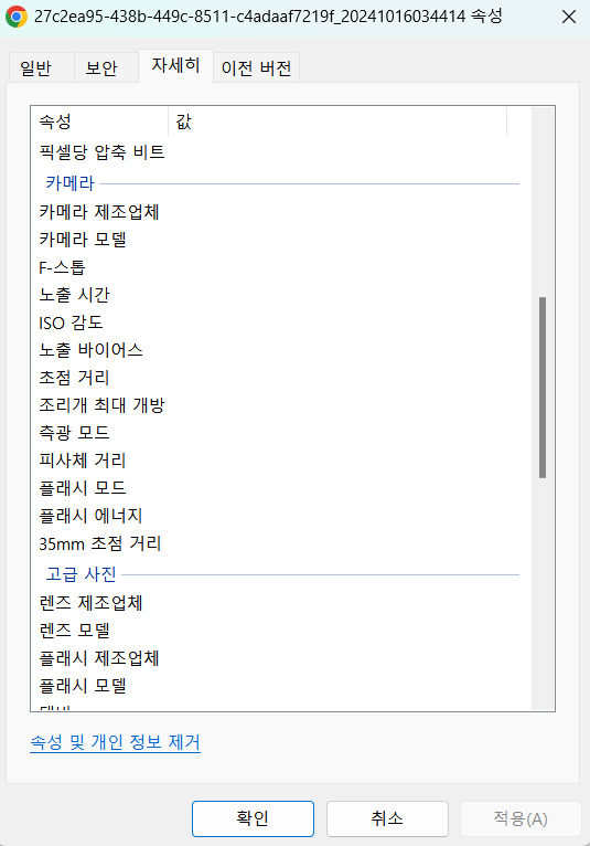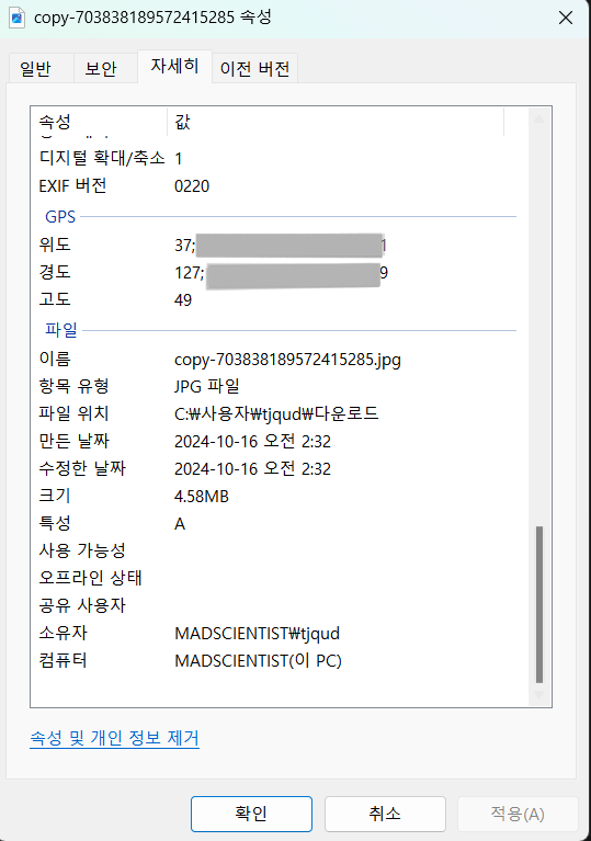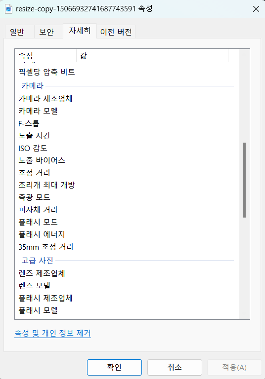 - 카메라 기종과 GPS 데이터가 삭제된 것을 볼 수 있다