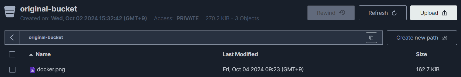 - MINIO 스토리지에 CopyFile이 업로드된 모습을 볼 수 있다