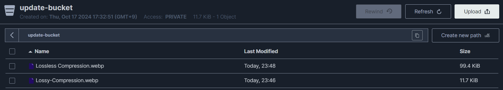 - MINIO 스토리지에 WebPFile이 업로드된 모습을 볼 수 있다