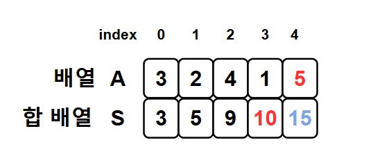 합 배열(S)은 배열의 각 위치까지의 누적 합을 저장한 배열입니다.