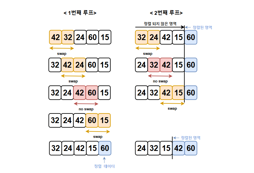 버블 정렬은 반복문이 두 개 중첩되어 있습니다. 따라서 O(n^2)으로 다른 정렬 알고리즘 보다 속도가 느린 편입니다.