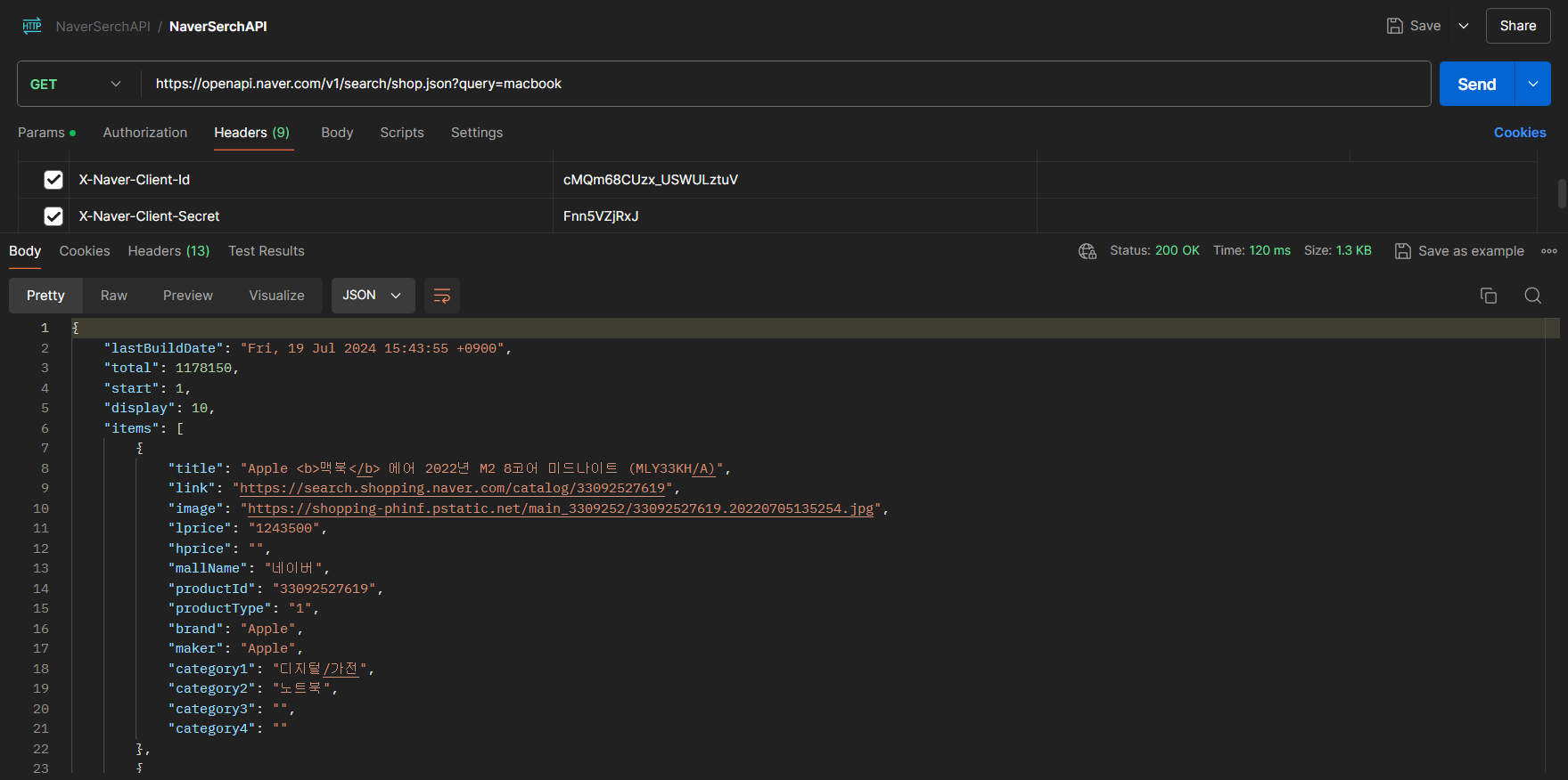네이버 쇼핑 검색 정보를 참조하여 Postman을 사용해 보자.