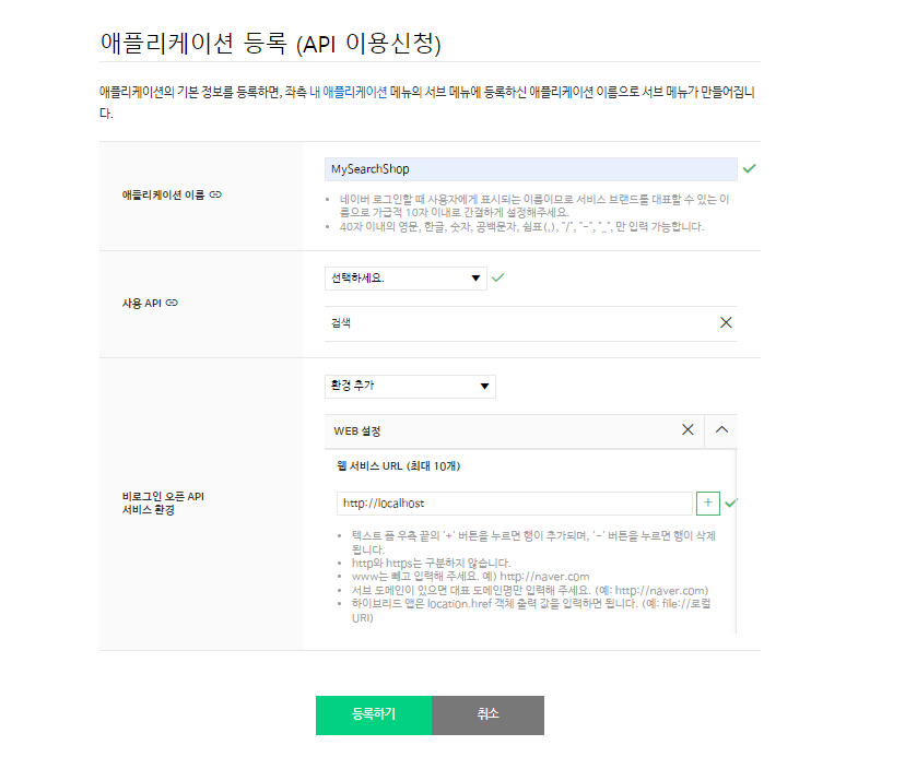 네이버 애플리케이션 등록 URL: https://developers.naver.com/apps/#/register