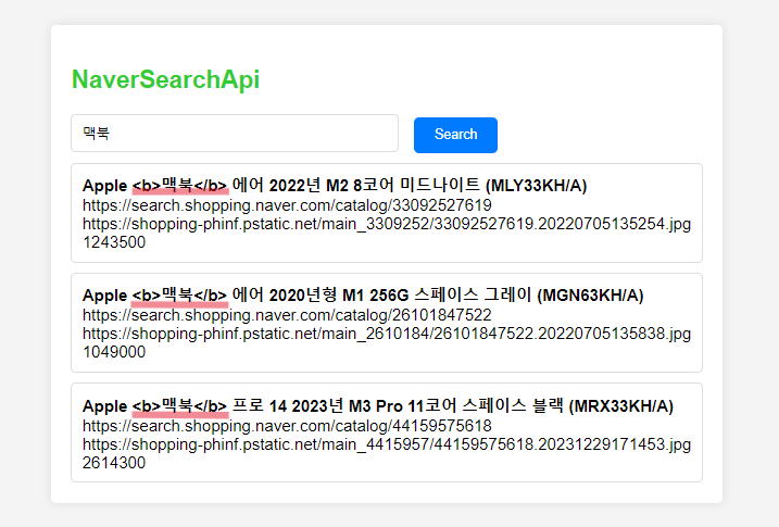 검색한 단어가 <b</b>태그에 담겨서 반환된 모습을 볼 수 있다.