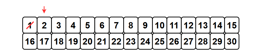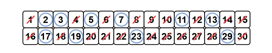 - 1부터 30까지의 소수 : 2, 3, 5, 7, 11, 13, 17, 19, 23, 29