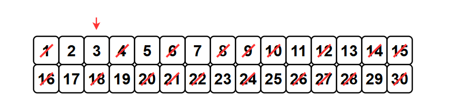 3️⃣ 다음 지워지지 않은 수를 선택하고 선택한 수의 모든 배수를 삭제합니다.