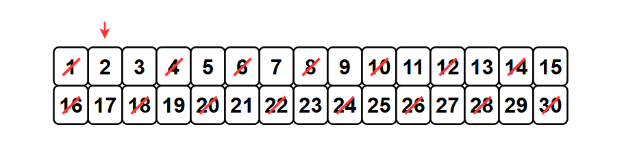 2️⃣ 선택한 수의 배수를 모두 삭제합니다. (현재의 경우 2의 배수를 모두 삭제)