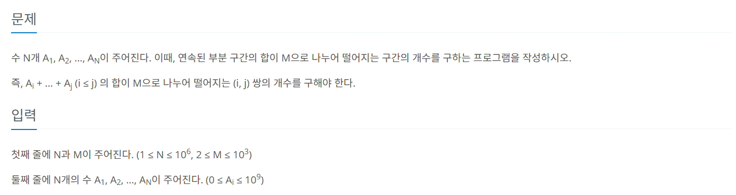 다시 문제로 돌아와, 우리는 연속된 부분의 합 (A[i]+ ... +A[j]) 이 M(3) 으로 나누어떨어지는 구간의 개수를 구해야 합니다.따라서,