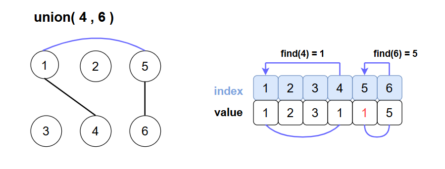 따라서, find(6)의 대표 노드가 '5'이므로, 노드 '5'의 대표 노드를 '1'로 변경합니다.