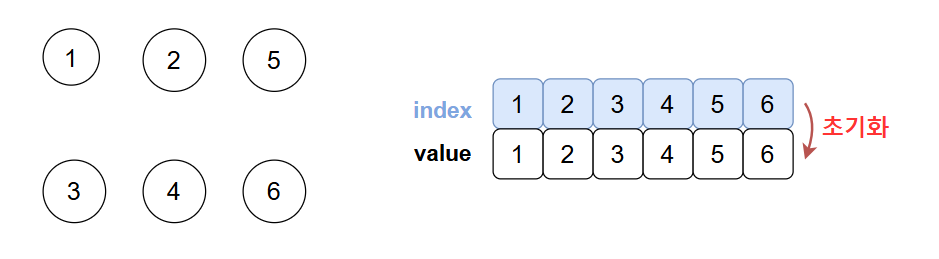 각 노드가 모두 대표노드 이므로 배열은 자신의 인덱스 값으로 초기화해 줍니다