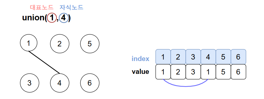 이제 두 개의 노드를 선택하여 각각의 대표 노드를 찾아 연결하는 Union 연산을 수행합니다.