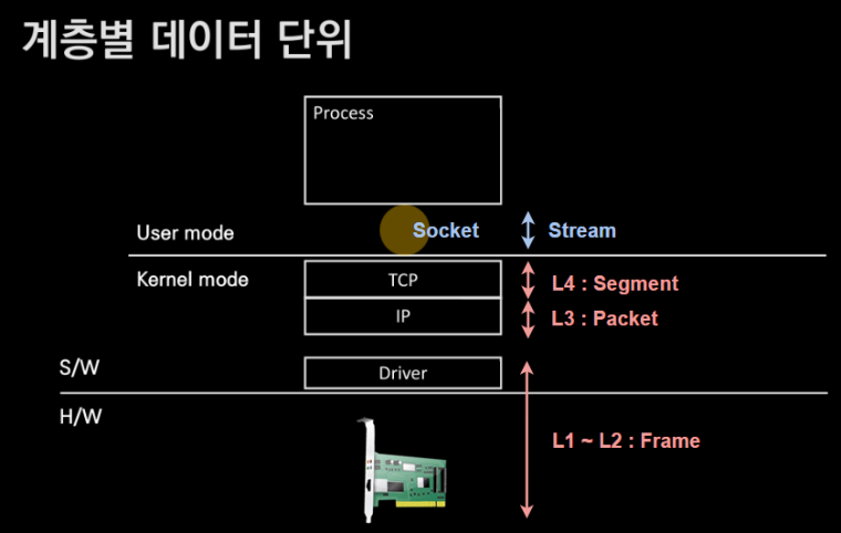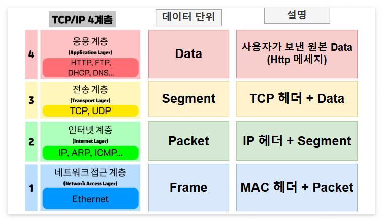 위 그림을 보면 TCP/IP에서 각 계층별 데이터 단위가 어떻게 나뉘는지 확인할 수 있어요.